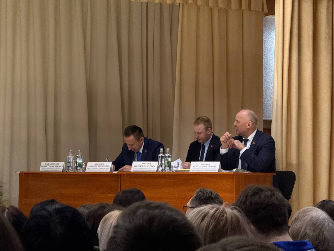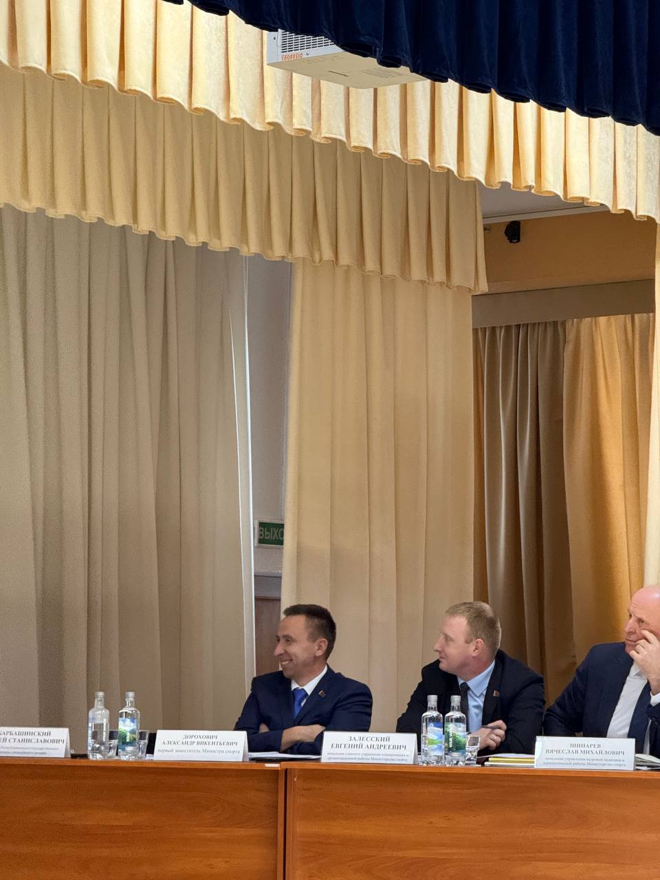 первый заместитель Министра спорта Республики Беларусь Александр Викентьевич Дорохович, а также начальник главного управления планирования и организационной работы Евгений Андреевич Залесский и начальник управления кадровой политики и идеологической работы Шипарев Вячеслав Михайлович.